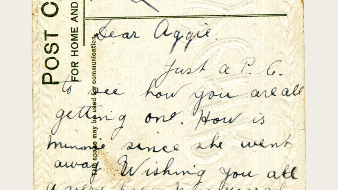 OMAFP.2013.43.442OMAFP.2013.43.320'Dear Aggie, Just a P. C. to see how you are all getting on. How is Minnie since she went away'. OMAFP.2013.43.19