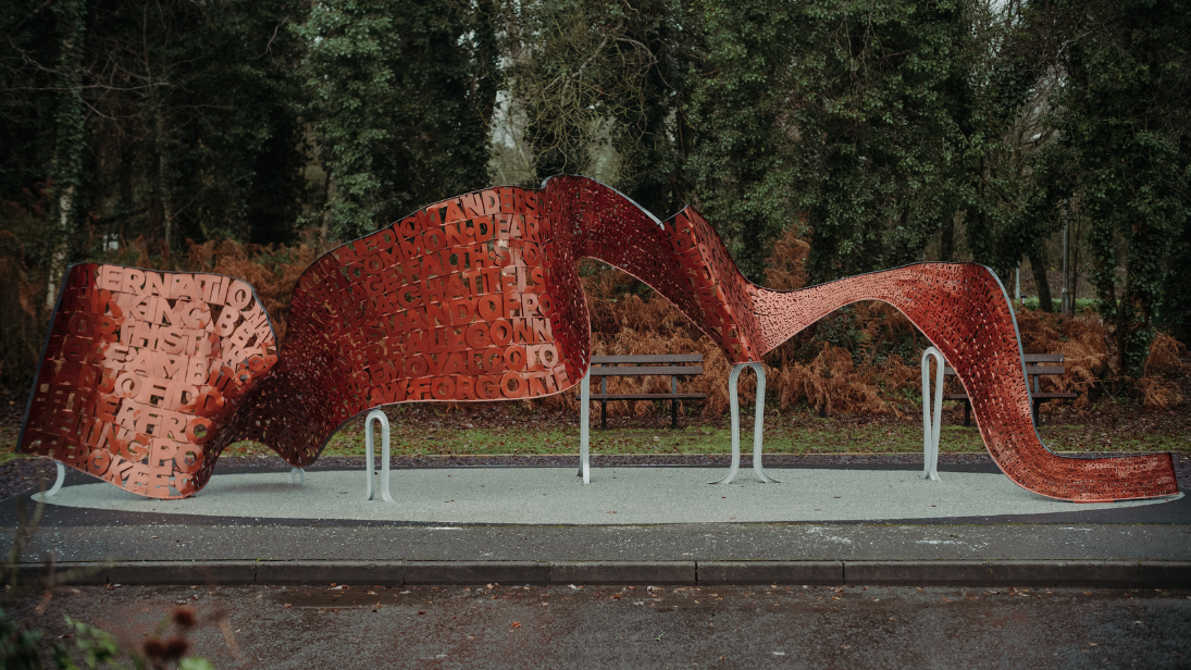 “The swoops, twists and turns of the words will mirror the momentum of the people who have made these journeys and will encourage people to walk around the work, reading it and connecting with it. In essence, the overall form is an amalgamation that reflects both the topography of Appalachia and the journeys of the people, symbolised by the murmuration feel to the artwork.”